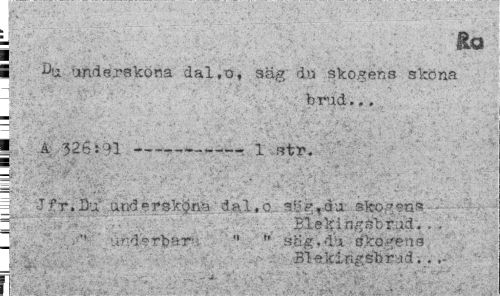 //// - Ra //// i ^u undersköna dal,o, säg dn skogens sköna //// - brud... //// y'1^;,- . .. ... : * ¦ -.Q ', - //// | Å; 326:91---t 1 str. //// i //// = Jfr. Du'"undersköns dal,o. sl;grdu sfeogenfc ¦ //// . Blek i ngsbr.ud. . . I underbar- " »* Hög,du-skogens //// Blekingsbr .id. . ////