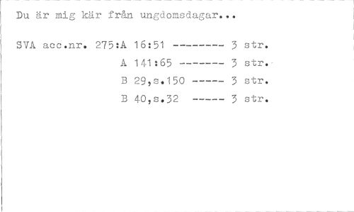 //// Du är mig kär från ungdonsdagar... //// SVA acc.nr. 275:A 16:51 ---3 str. //// A 141:65---3 str. //// B 29,3.150 --- 3 str. //// B 4-0,s.32 ---3 str. ////