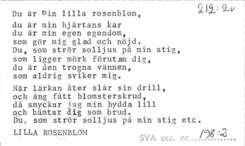 //// Du är Pin lilla rosenblom, * //// du är min hjärtans kar //// du är min egen egendom, //// som gör mig glad och nöjd. //// Du, som strör solljus på min stig, //// som ligger mörk förutan dig, //// du är den trogna vännen, //// som aldrig sviker mig. //// När lärkan åter slår sin drill, //// och äng fått blomsterskrud, //// då smyckar jag min hydda lill //// och hämtar dig som brud. //// Du, som strör solljus på min stig etc. //// LILLA ROSENBLOM jVA OCC. nr ////