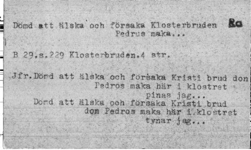 //// i Dömd »t t Kl ska' och försaka Klosterbruden »O 1 Pedri'8 maka,,. //// i //// , B 29fS.?20 Klosterbruden.4 str. //// .Jfr.Dörd att älska och försaka Kristi brud don //// Pedros maka här i klostret pinas .jag... Dord att älska ooh försaka Kristi brud //// don Pedro3 maka här i.klostret tynar jeg... ////