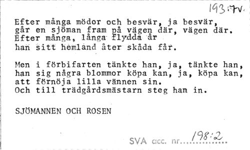 //// Efter många mödor och besvär, ja besvär, går en sjöman fram på vägen där, vägen där. Efter många, långa flydda år han sitt hemland åter skåda får. //// Men i förbifarten tänkte han, ja, tänkte han, han sig några blommor köpa kan, ja, köpa kan, att förnöja lilla vännen sin. Och till trädgårdsmästarn steg han in. //// SJÖMANNEN OCH ROSEN //// SVA ccc. nr ////