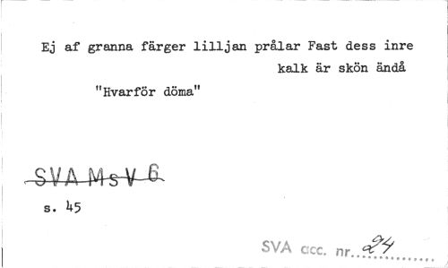 //// Ej af granna färger lilljan prålar Fast dess inre //// kalk är skön ändå //// "Hvarför döma" //// .-S-V-Å-M-s-V-^-- //// s. b5 //// SVA cscc. nr..fft. ////