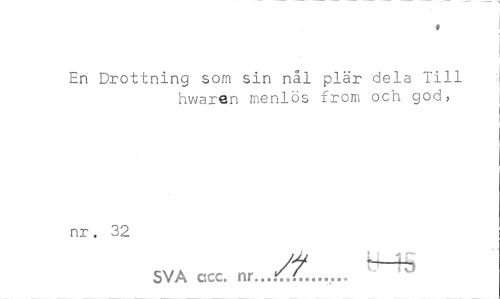 //// t //// En Drottning som sin nål plär dela Till hwaren menlös from och god, //// nr. 32 //// H-45 //// SVA ccc. nr... ////
