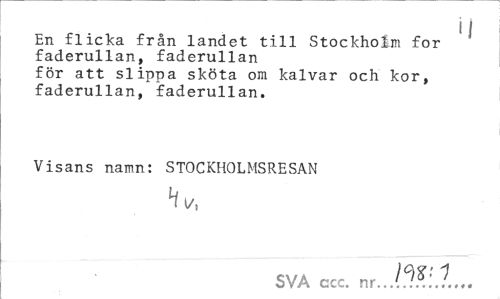 //// i | //// En flicka från landet till Stockholm for faderullan, faderullan //// för att slippa sköta om kalvar och kor, faderullan, faderullan. //// Visans namn: STOCKHOLMSRESAN Hv, //// SVA ccc. nr...U?ll... ////