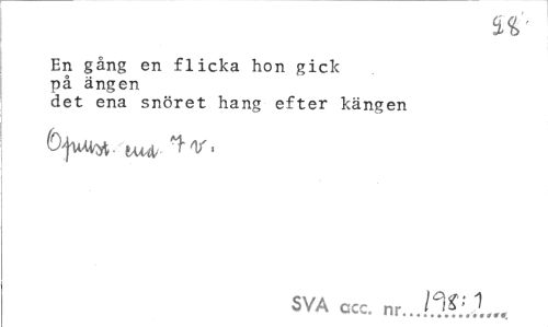 //// En gång en flicka hon gick på ängen //// det ena snöret hang efter kängen //// SVA ccc, nr.J.llvL, ////