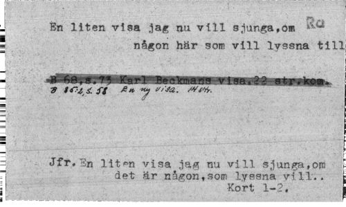 //// En liten visa jag nu vill sjunga,o« //// 1 någon här som vill lyssna till //// i1 v» //// . jflHfea.?^ Karl Beckmans visa,22 str.koa. //// ¦8 i<r-t. fs y "/-ja. //// B //// a Jfr, lin lit^n visa jag nu vill sjunga,om //// det är någon,som lyssna vill.. //// 1 Kort 1-2. //// i ////