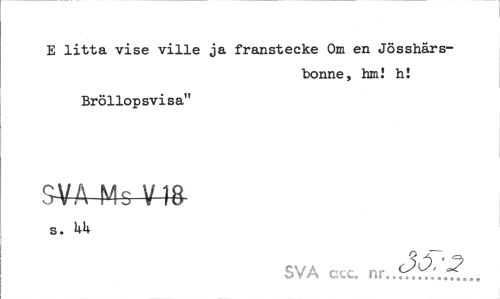 //// E litta vise ville ja franstecke Om en Jösshärs- //// bonne, hm! h! //// Bröllopsvisa" //// SVA Ms V 18 //// s. UU //// SVA ccc. nr ////