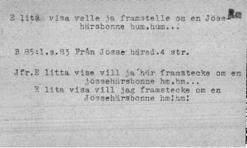 //// B lita visa velie ja främstelle oro en Jöss-^® härsbonne hum,hum... //// . ¦ ¦ : '' ¦ '" ¦' v. ' - i'- .¦'/¦¦ ' i ¦''' ' " . '; " ;'.'"¦' ¦ ' //// B 85:1»s.83 Från Jossc härad»4 str. //// Jfr.E litta vise vill ja'har framstecke om en jössehärsbonne hm»hm... E lita visa vill jag framstecke om en Jössehärsbonne hmlhmi ////