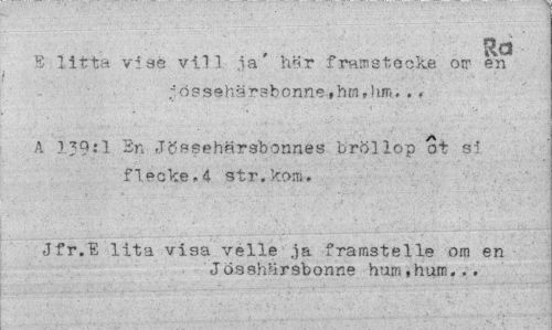 //// Ra //// E 111 ta vise vill ja' Mr f-ramstocke otr en ;'össehärsbonne#hrn»hm.., //// A 139:1 En Jössehärsbonnes bröllop ot si flscke.4 str.kom. //// Jfr.E lita visa velie ja framstelle om en Josshärsbonne hum»hum... ////