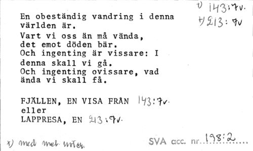 //// v I //// En obeständig vandring i denna \-l Q \ 2 , världen är. TV //// Vart vi oss än må vända, //// det emot döden bär. //// Och ingenting är vissare: I //// denna skall vi gå. //// Och ingenting ovissare, vad //// ända vi skall få. //// FJÄLLEN, EN VISA FRÄN eller //// LAPPRESA, EN %% //// mål iMéfc. SVA ccc- nr..1 ////