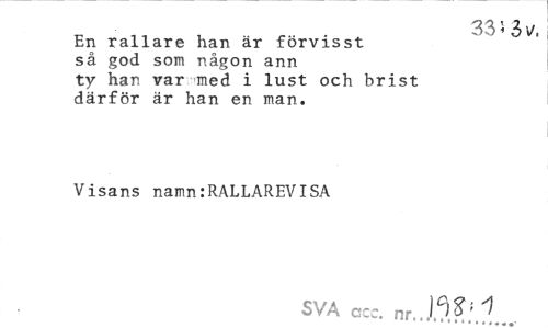 //// 33i3v. //// En rallare han är förvisst så god som någon ann ty han var med i lust och brist därför är han en man. //// Visans namn:RALLAREVISA //// SVA ccc. nr. ////