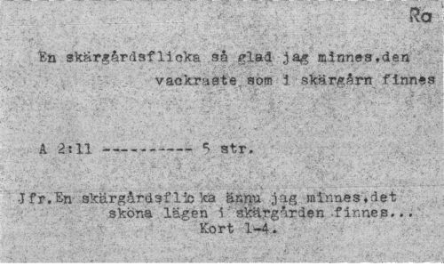 //// t: . • "V ..'"V ¦'.¦"¦ //// Pn //// ' ¦¦-X'": V <t ' //// En Ä»r«&rdaflio}ca aå glad jag minnes,den //// vackraste som i skärgårn finnes //// ¦ -k . v. ¦'"/ " ¦ ¦ i'/¦:¦ -I" ' //// a -: 11 -... i str. //// -Tfr.En skärgårdsflicka är,nu jag minnes,det skona lägen i'' skärgården -finnes... Kort ////