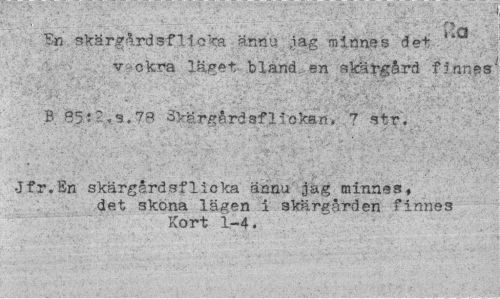 //// •V";,' '•' ' \ •'* ¦ •¦ ' ' ' ,:>' ':• ¦¦ -* ¦¦ //// - »la //// En skärgårdsflicka ännu »jag minnes det //// v ekra läget bland en skärgård finnes //// B 85J2.S.78 dkärgårdsf1ickan. 7 str, //// ¦ -V.-v..,Vmx //// •Jfr,En skärgårdsflicka ännu jäg minnes, //// det sköna lägen i skärgården finnes Kort 1-4. ////