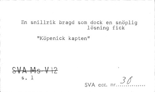 //// En snillrik bragd som dock en snöplig //// lösning fick //// "Köpenick kapten" //// SV A Mg y\2 //// s- 1 36 //// SVA ccc. nr... ////