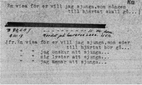 //// tn visa för er vill jag sjunga,som mången //// till hjärtat skall //// JHHHBBBHHHHHHHBHHK //// -9 fö,**/ — --- " //// q/J/:'? Vtrka-^J Usa**" //// Jfr.ta visa för er vill jag sjunga,som eder //// till hjärtat hör ga... " " jag önskar att sjunga... "mig lvster att sjunga... " jag ämnar a t; t sjunga... ////