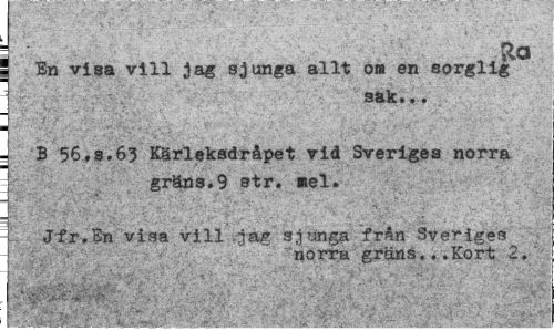 //// En viga vill jag sjunga allt om en sorglig0 //// sak... //// ' -V- //// 3 B 56.S.63 Kärleksdråpet vid Sveriges norra ; gräns.9 str. mel. //// Jfr.En visa vill' jag sjunga från Sveriges //// norra gräns...Kort 2. //// I' //// 1 " A . K ' ¦' r . ... //// - -K - ' '¦ ^ , ' * - ////