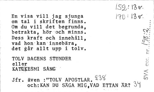 //// iscJb' //// En visa vill jag sjunga iTD : 13 V- //// om tal i skriften finns. //// Om du vill det begrunda, • //// betrakta, hör och minns. T* //// Dess kraft och innehåll, vad hon kan innebära, //// det går allt upp i tolv. J //// c //// TOLV DAGENS STUNDER <J //// -ii (' eller t //// KATEKESMI SÄNG //// Jfr. även : "TOLV APOSTLAR. ^ //// och:KAN DU SÄGA MIG,VAD ETTAN ÄR? Vj ////