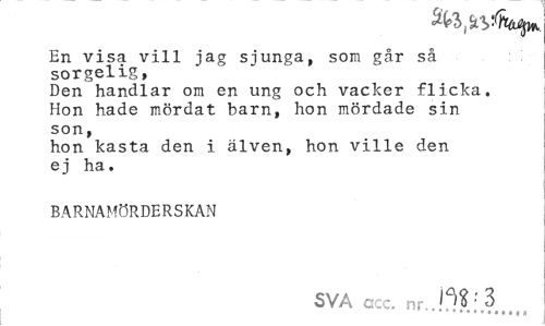 //// En visa vill jag sjunga, som går så sorgelig, //// Den handlar om en ung och vacker flicka. Hon hade mördat barn, hon mördade sin son, //// hon kasta den i älven, hon ville den ej ha. //// BARNAMÖRDERSKAN //// SVA acc. nr : 3 //// *...i • ////