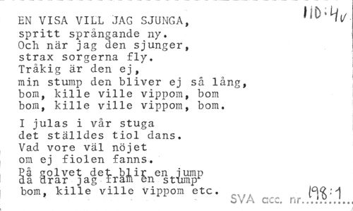 //// EN VISA VILL JAG SJUNGA, ' ^ ' Hi/ //// spritt språngande ny. //// Och när jag den sjunger, //// strax sorgerna fly. //// Tråkig är den ej, //// min stump den bliver ej så lång, //// bom, kille ville vippom, bom //// bom, kille ville vippom, bom. //// I julas i vår stuga det ställdes tiol dans. Vad vore väl nöjet om ej fiolen fanns. //// cLa. årare^ageira^iiInestii^p //// bom, kille ville vippom etc. _W1 t^ft'd //// SVA ccc. nr...';?..:.. ////
