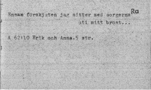 //// Ra //// Ensam försluten jag sitter med sorgerna / iiti mitt bröst . .. //// A 62:10 Erik och Anna.5 str. //// i ¦ £ C ' • ////