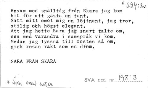 //// Ensam med snälltåg från Skara jag kom //// hit för att gästa en tant. //// Satt mitt emot mig en löjtnant, jag tror, //// stilig ofch högst elegant. //// Att jag hette Sara jag snart talte om, //// sen med varandra i samspråk vi kom. //// Medan jag lyssna till rösten så öm, //// gick resan rakt som en dröm. //// SARA FRÄN SKARA //// . ' n , SVA ccc. nr..Ö.?. //// * WM U/tt ////