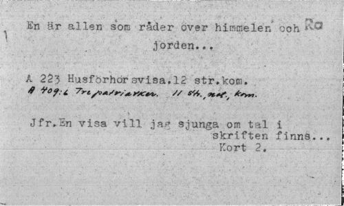 //// i ' > •"<> _ En är allén som råder över hiromelen ooh //// jorden... A 223 Husförhörsvisa.12 str.kom. //// Jfr.En visa vill jaf* sjunga om tal i //// skriften finns... Kort 2. ////