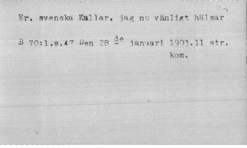 //// Er, svenska Kallar, jag nu vänligt hälsar //// B 70:l,s.A? -Uen ?8 januari 190"*. 11 str. //// kom, ////