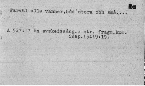 //// Ra //// Farväl alla vänner,bad'stora och små... //// A 527:17 En avskedssång.2 str. fragm.kom. //// insp.15419:19. ////