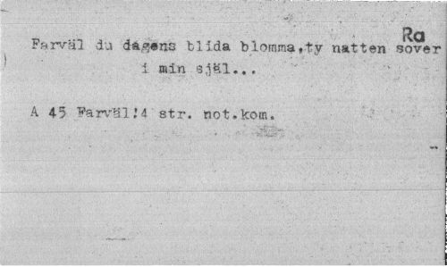 //// Ra //// Farväl du da.^ns blida blomma,ty natten sover 1 i min //// A 45 Farväl!4 str. not.kom. ////