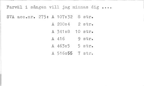 //// Farväl i sängen vill jag minnas dig ... //// SVA acc.nr. 275: A 107:32 8 str. //// A 200:4 2 str. A 341:8 10 str. A 416 9 str. A 463:5 5 str. A 516:65 7 str. ////