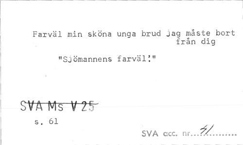 //// Farväl min sköna unga brud jag måste bort //// från dig //// "Sjömannens farväl'." //// SVA Ms V 25- //// SVA ccc. nr.. •<<... ////