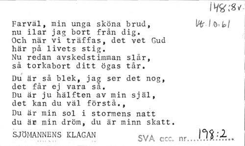 //// Farväl, min unga sköna brud, IHf lö-k/ //// nu ilar jag bort från dig. //// Och när vi träffas, det vet Gud //// här på livets stig. //// Nu redan avskedstimman slår, //// så torkabort ditt ögas tår. //// Du är så blek, jag ser det nog, //// det får ej vara så. //// Du är ju hälften av min själ, //// det kan du väl förstå., //// Du är min sol i stormens natt //// du är min dröm, du är minn skatt. //// SJÖMANNENS KLAGAN SVA f , nr 'X ////