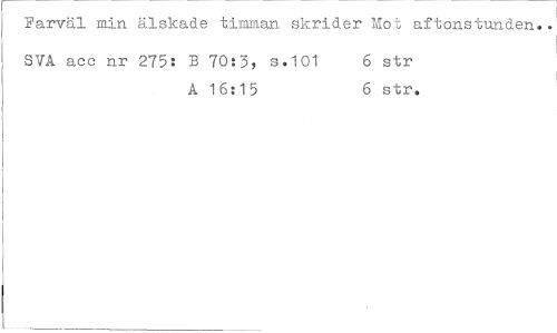 //// Farväl min. älskade timman skrider Mot aftonstunden.. //// SVA acc nr 275: B 70:3, s.101 6 str A 16:15 6 str. ////