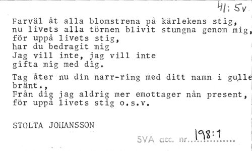 //// II ) ^ v //// Farväl ät alla blomstrena på kärlekens stig, //// nu livets alla törnen blivit stungna genom mig //// för uppä livets stig, //// har du bedragit mig //// Jag vill inte, jag vill inte //// gifta mig med dig. //// Tag åter nu din narr-ring med ditt namn i gull< bränt., //// Från dig jag aldrig mer emottager nån present, för uppå livets stig o.s.v. //// STOLTA JOHANSSON //// SVA ccc. nr.JMll... ////