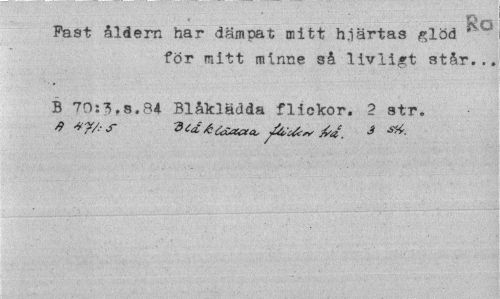 //// Ra //// Fast åldern har dämpat mitt h.iärtas glöd ~ for mitt minne så livligt står... //// B 70:s.84 Blåklädda flickor. 2 str. ////