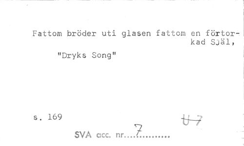 //// Fattom bröder uti glasen fattom en förtorkad Själ, //// "Dryks Song" //// s. 169 tf^ SVÅ cscc. nr ...t,... ////