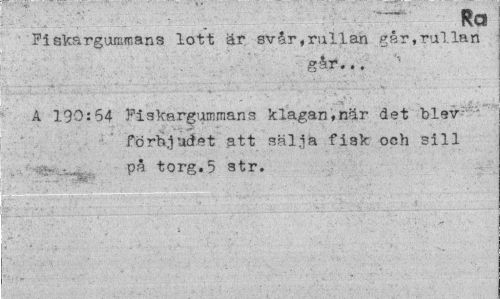 //// Ra //// Fiskargummans lott är svår,rullan går,rullan //// går... //// A 190:54 Fiskargummans klagan,när det blev förbjudet att sälja fisk och sill • •<--..w på torg. 5 str. ////
