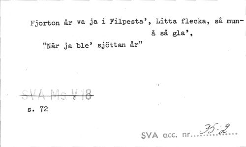 //// Fjorton år va ja i Filpesta', Litta flecka, så mun- //// å så gla', //// "När ja ble' sjöttan år" //// ¦ . ¦ vi-" j v :8 //// s. 72 //// SVA gcc. ////