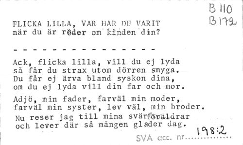 //// B i 10 //// FLICKA LILLA, VAR HAR DU VARIT G> Y\% //// när du är ri&der om kinden din? //// Ack, flicka lilla, vill du ej lyda så får du strax utom dörren smyga. Du får ej ärva bland syskon dina, om du ej lyda vill din far och mor. //// Adjö, min fader, farväl min moder, farväl min syster, lev väl, min broder. Nu reser jag till mina svärföräldrar och lever där så mången gläder dag. //// I | o "*Ci //// SVA ccc. nr... ////