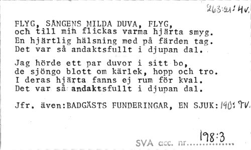 //// FLYG, SANGENS MILDA DUVA, FLYG, och till min flickas varma hjärta smyg. En hjärtlig hälsning med på färden tag. Det var så andaktsfullt i djupan dal. //// Jag hörde ett par duvor i sitt bo, de sjöngo blott om kärlek, hopp och tro. I deras hjärta fanns ej rum för kval. Det var så andaktsfullt i djupan dal. //// Jfr. även'.BADGÄSTS FUNDERINGAR, EN SJUK: /<?()', T(/ //// SVA ccc. nr...//... ^ ''' ////