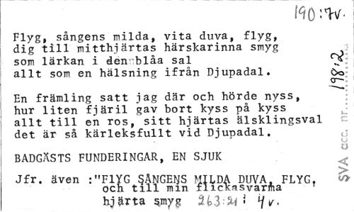 //// MO ilv- //// Flyg, sångens milda, vita duva, flyg, dig till mitthiärtas härskarinna smyg som lärkan i denrblåa sal allt som en hälsning ifrån Djupadal. //// o ¦ //// En främling satt jag där och hörde nyss, hur liten fjäril gav bort kyss på kyss allt till en ros, sitt hjärtas älsklingsval det är så kärleksfullt vid Djuoadal. //// BADGÄSTS FUNDERINGAR, EN SJUK //// Jfr. även :"F1YG SÄNGENS MILDA DUVA, FLYG, och till mm flicTcasvarma 7 //// hjärta smyg 343 ^ • H*< ////