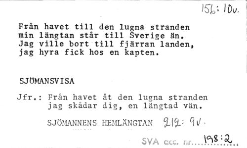 //// 15t'. lOu. //// Från havet till den lugna stranden min längtan står till Sverige än. Jag ville bort till fjärran landen, jag hyra fick hos en kapten. //// SJÖMANSVISA //// Jfr.: Från havet åt den lugna stranden jag skådar dig, en längtad vän. //// SJÖMANNENS HEMLÄNGTAN C\\l ¦ //// SVA ccc. nr.. ^ ;cl ////