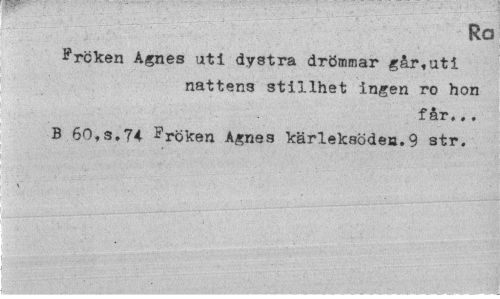 //// Ra //// Frcken Agnes uti dystra drömmar går,uti //// nattens stillhet ingen ro hon //// får,,. //// B 60,s.74 Fröken Agnes kärleksöden.9 str. ////