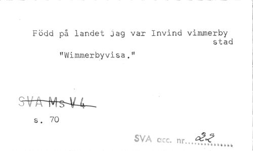 //// Född på landet Jag var Invind vimmerby //// stad //// "Wimmerbyvisa." //// s. 70 //// SVA ccc. nr... ////
