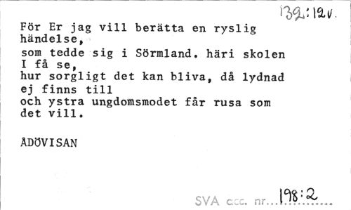 //// r^nai/. //// För Er jag vill berätta en ryslig händelse, //// som tedde sig i Sörmland, häri skolen I få se, //// hur sorgligt det kan bliva, då lydnad ej finns till //// och ystra ungdomsmodet får rusa som det vill. //// ÅDÖVISAN //// SVA ccc. nr...11?/.!?'... ////