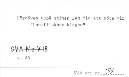//// Förgäves uppå stigen jag dig att möta går "Lantflickans klagan" //// SVA Mg VH //// s. 48 //// SVA ccc. nr... ... ////