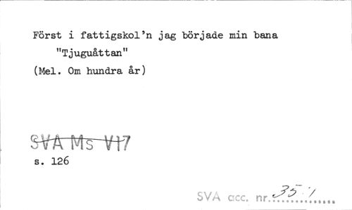 //// Först i fattigskol'n jag började min bana //// "Tjuguåttan" (Mel. Om hundra år) //// SY/frtte-vt? //// s. 126 //// SVA ccc. nr.ffS?...'/...,. ////