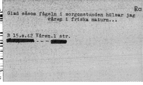 //// I . Ra //// j Glad såsom fågeln i morgonstunden hälsar jag | våren i friska naturn... //// - B 15,8.4-2 Våren.1 str. ////