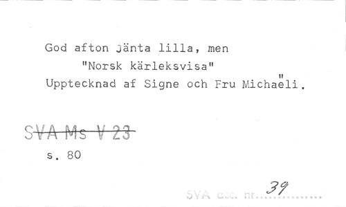 //// God afton jänta lilla, men "Norsk kärleksvisa" //// ii //// Upptecknad af Signe och Fru Michaeli. //// SVA Ms V 23 //// s. 80 //// v v i ^ 1 >. - c ., c t c i. » •> O t 9 9 9 9 ////