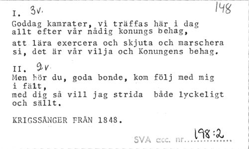 //// Goddag kamrater, vi träffas här i dag allt efter vår nådig konungs behag, //// att lära exercera och skjuta och marschera si, det är vår vilja och Konungens behag. //// II. //// Men hör du, goda bonde, kom följ med mig i fält, //// med dig så vill jag strida både lyckeligt och sällt. //// KRIGSSÅNGER FRÅN 18 48. //// SVA ccc. nr.../.:£-.,..., ////